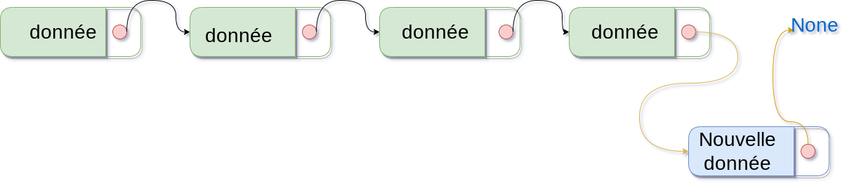 Pour insérer une valeur en fin de liste, on créer un maillon ayant la valeur souhaitée et pour suivant None, on le place ensuite comme suivant du dernier élément de la liste.