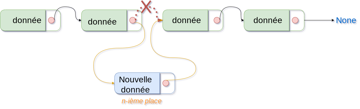 Pour insérer un maillon à l'indice n, on créer un maillon ayant la valeur souhaitée et pour suivant le maillon à l'indice n et on change le lien du maillon à l'indice n-1 pour qu'il point vers le nouveau maillon.