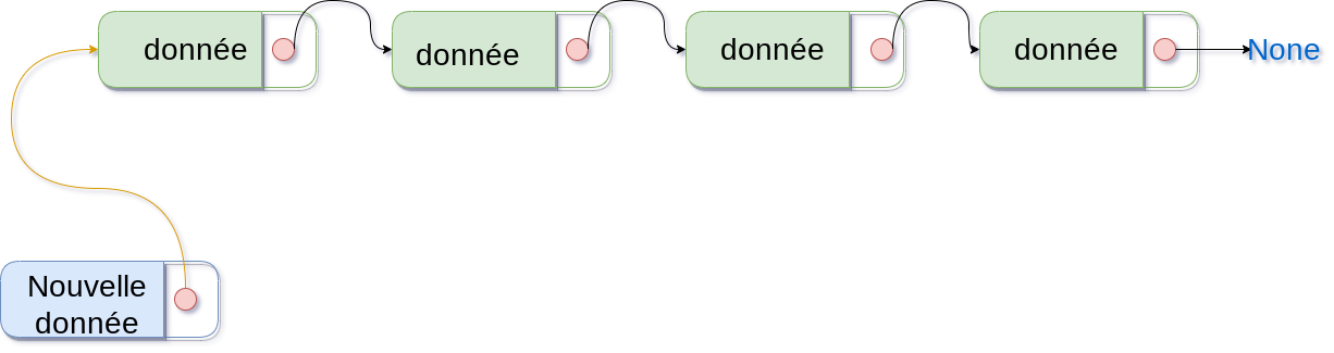 Pour insérer une valeur en fin de liste, on créer un maillon ayant la valeur souhaitée et pour suivant None, on le place ensuite comme suivant du dernier élément de la liste.